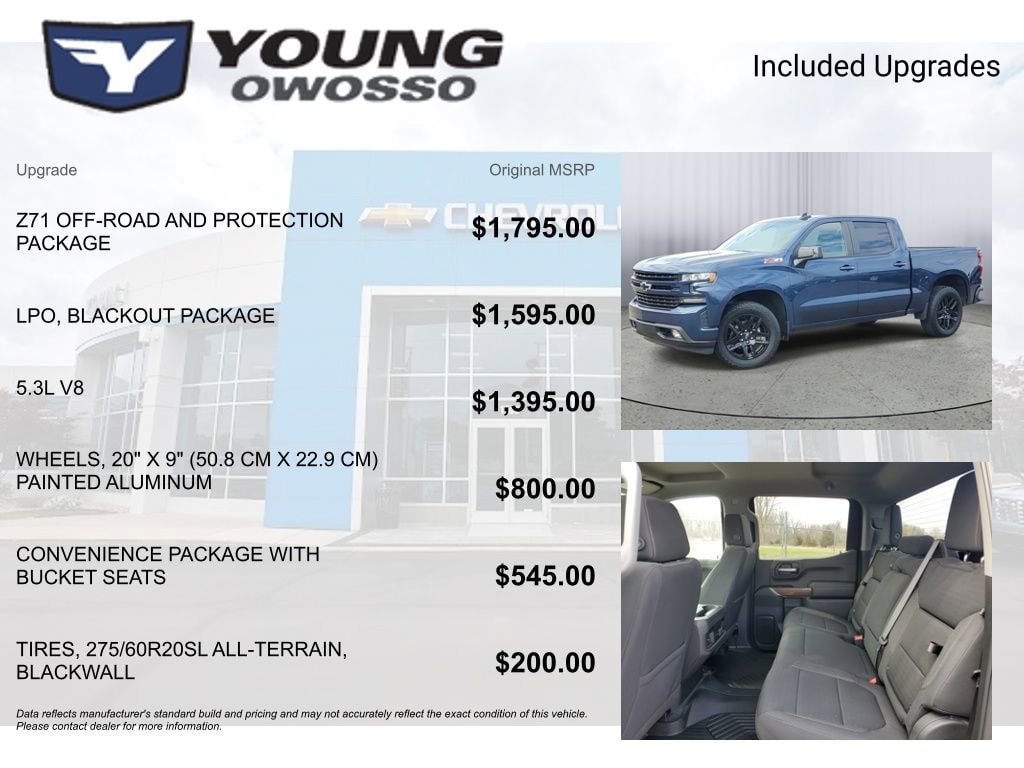 LOCAL TRADE!, Silverado 1500 RST, 4D Crew Cab, EcoTec3 5.3L V8, 4WD, 10-Way Power Driver Seat w/Lumbar, 12-Volt Rear Auxiliary Power Outlet, 2 USB Ports (First Row), 4.2 Diagonal Color Display Driver Info Center, 4G LTE Wi-Fi Hot Spot Capable, 6-Speaker Audio System, All-Star Edition, All-Weather Floor Liner (LPO) (AAK), Auto-Locking Rear Differential, Bed Protection Package, Black Name Plates (LPO), Blackout Package (LPO), Bluetooth® For Phone, Body Color Grille, Chevrolet Connected Access Capable, Chevytec Spray-On Black Bedliner, Cloth Rear Seat w/Storage Package, Color-Keyed Carpeting Floor Covering, Compass, Convenience Package, Convenience Package w/Buckets Seats, Dark Essentials Package (LPO), Deep-Tinted Glass, Dual Exhaust w/Polished Outlets, Dual-Zone Automatic Climate Control, Electric Rear-Window Defogger, Electrical Lock Control Steering Column, Electronic Cruise Control, EZ Lift Power Lock & Release Tailgate, Floor Mounted Center Console, Front Bucket Seats, Front Frame-Mounted Black Recovery Hooks, Front LED Fog Lamps, Front Rubberized Vinyl Floor Mats, Heated Driver & Front Outboard Passenger Seats, Heated Steering Wheel, Heavy-Duty Air Filter, High Gloss Black Mirror Caps, Hill Descent Control, Hitch Guidance, Keyless Open & Start, Leather Wrapped Steering Wheel, LED Cargo Area Lighting, Manual Tilt/Telescoping Steering Column, Off-Road Suspension, OnStar & Chevrolet Connected Services Capable, Power Door Locks, Power Front Windows w/Driver Express Up/Down, Power Front Windows w/Passenger Express Down, Power Rear Windows w/Express Down, Preferred Equipment Group 1SP, Rear 60/40 Folding Bench Seat (Folds Up), Rear Dual USB Charging-Only Ports, Rear Rubberized-Vinyl Floor Mats, Rear Vision Camera, Rear Wheelhouse Liners, Remote Vehicle Starter System, SiriusXM Radio, Standard Tailgate, Steering Wheel Audio Controls, Theft Deterrent System (Unauthorized Entry), Trailering Package, Wheels: 20 5-Split Spoke High Gloss Black (LPO), Z71 Off-Road & Protection Package, Z71 Off-Road Package.