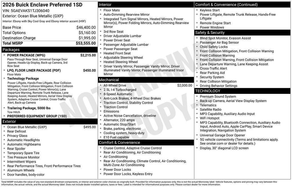 Ocean Blue Metallic 2026 Buick Enclave Preferred AWD 8-Speed Automatic 2.5L DOHC AWD.Recent Arrival!