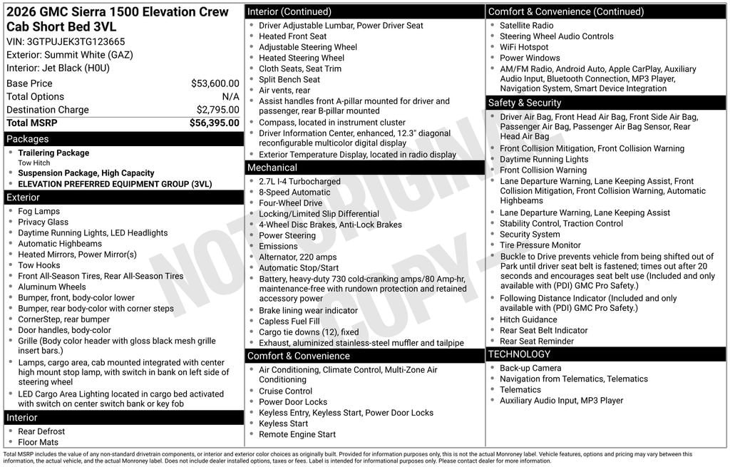 Summit White 2026 GMC Sierra 1500 Elevation 4WD 8-Speed Automatic 2.7L I4 Turbocharged DOHC 16V LEV3-SULEV30 310hp 8-Speed Automatic, 4WD, Black Cloth.