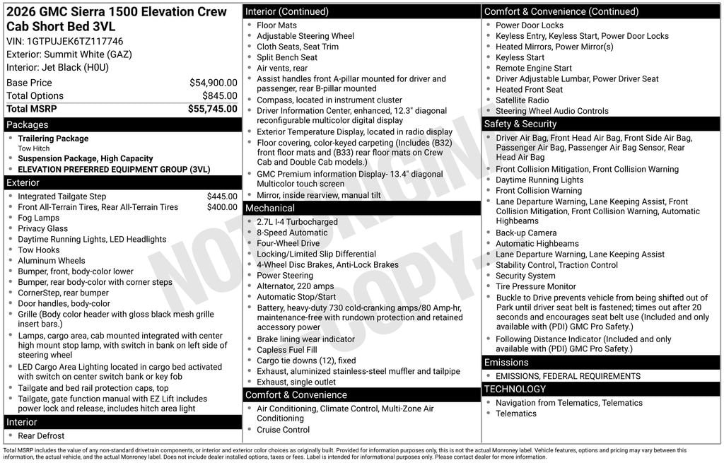 Summit White 2026 GMC Sierra 1500 Elevation 4WD 8-Speed Automatic 2.7L I4 Turbocharged DOHC 16V LEV3-SULEV30 310hp 8-Speed Automatic, 4WD, Black Cloth.