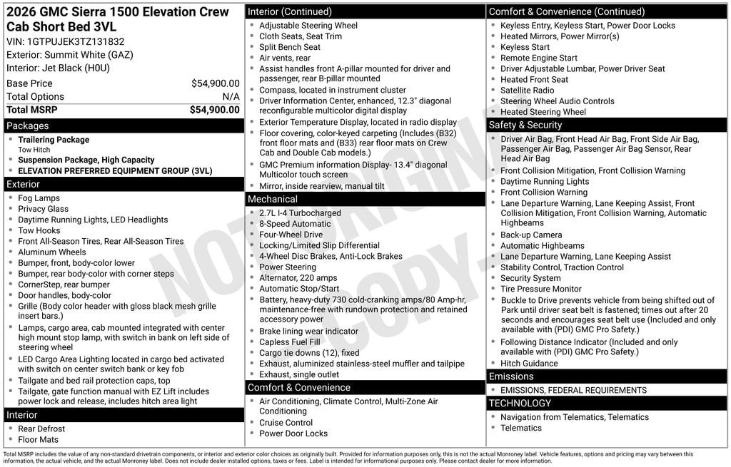 Summit White 2026 GMC Sierra 1500 Elevation 4WD 8-Speed Automatic 2.7L I4 Turbocharged DOHC 16V LEV3-SULEV30 310hp 8-Speed Automatic, 4WD, Black Cloth.