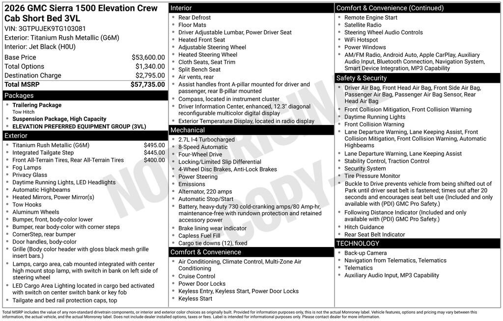 Titanium Rush Metallic 2026 GMC Sierra 1500 Elevation 4WD 8-Speed Automatic 2.7L I4 Turbocharged DOHC 16V LEV3-SULEV30 310hp 8-Speed Automatic, 4WD, Black Cloth.