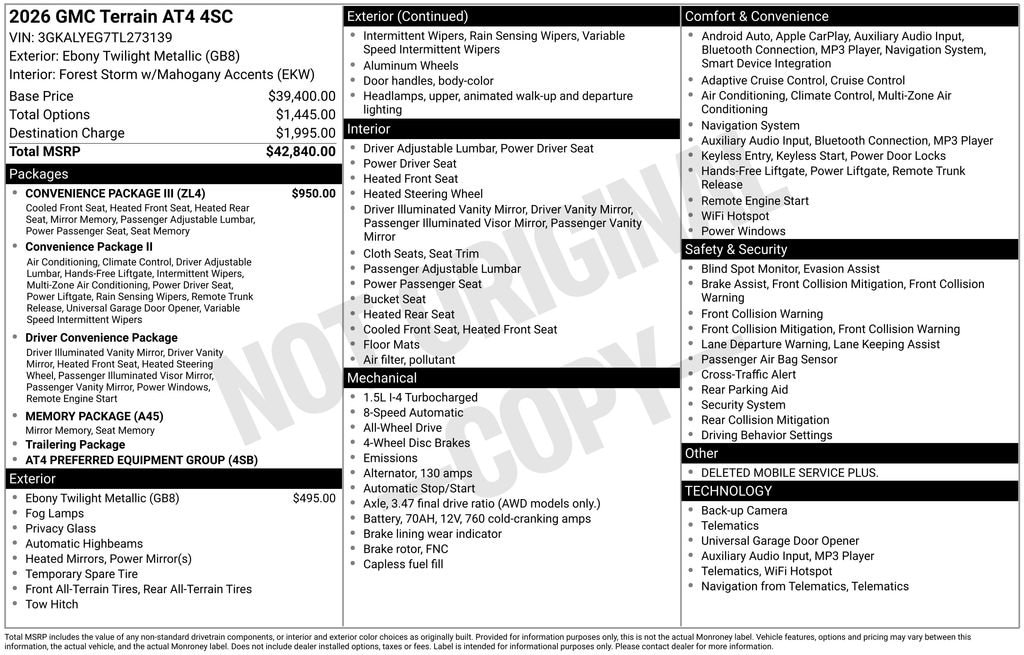 Ebony Twilight Metallic 2026 GMC Terrain AT4 AWD 8-Speed Automatic with Overdrive 1.5L DOHC AWD.