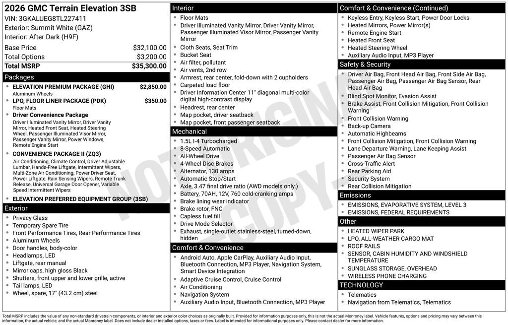 Summit White 2026 GMC Terrain Elevation AWD 8-Speed Automatic with Overdrive 1.5L DOHC AWD.